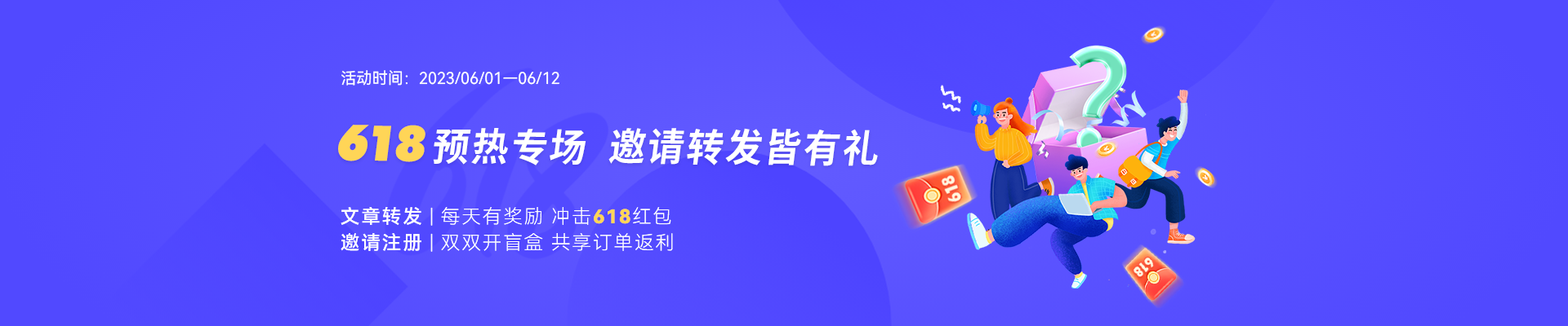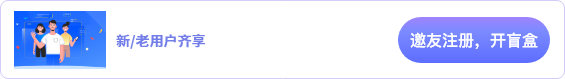 活動期間新注冊用戶可獲得一次開盲盒機會(100%中獎),新/老用戶均可通過邀請好友注冊獲得開盲盒機會(100%中獎),多邀多得,并共享訂單10.5%返利!